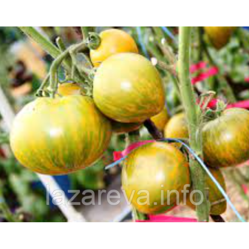 Плоди овально-серцевидної форми, вагою до 120 г, зелено-охрового кольору з декоративними полосками. Томати відрізняються високою врожайністю та привабливим зовнішнім виглядом, який прикрасить будь-яку страву або салат.