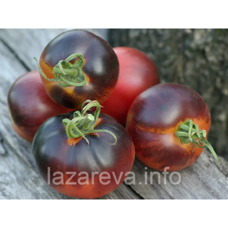 Плоди мають неймовірно привабливий вигляд: вони поєднують насичений малиновий колір зверху з антоціановими, майже темно-синіми боками, що створює ефект глибокого, унікального відтінку. Вага кожного томата коливається від 100 до 200 грамів. М’якоть вишнева, соковита, дуже солодка з легкими фруктовими нотками, що робить цей сорт шикарним вибором для свіжих салатів і вишуканих страв.