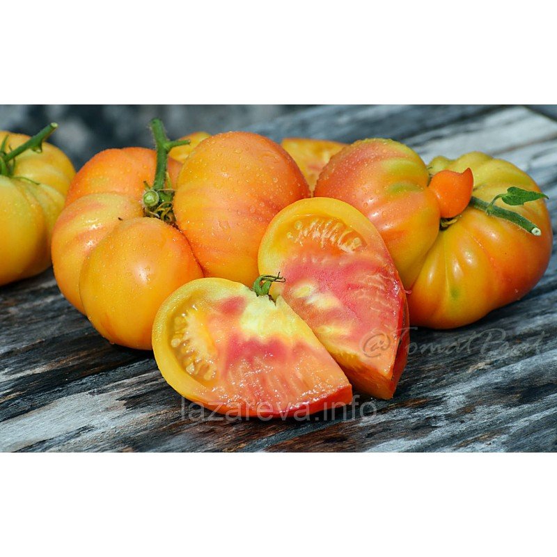 Плоди сорту важать від 150 до 300 грамів і мають форму «біфштекса» — сплощені, з округлими й ребристими плечима, які дивують своєю естетикою. Їхній яскраво-жовтий колір доповнює ніжний червоний рум’янець, особливо виразний у нижній половині кожного плода. М'якоть соковита і м'ясиста, а смак збалансований та насичений, не поступається найкращим двоколірним сортам.